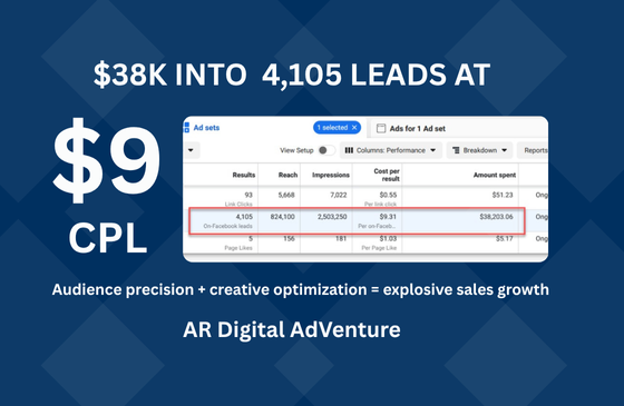 This client needed a consistent flow of high-quality leads to fuel their sales pipeline. We built and optimized Facebook Lead Ads with precise audience targeting and compelling creatives. With $38,203 in ad spend, the campaign reached over 824,000 people, delivered 2.5M impressions, and generated 4,105 qualified leads at only $9.31 per lead — creating a scalable and predictable growth engine.